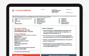 We understand that treatment planning for your cancer patients can be complex. That’s why we’re updating our FoundationOne CDx and FoundationOne Liquid CDx reports to pull the “Professional Services” summary section to the first page. This update will bring information for all reported biomarker and genomic findings and our new “Report Highlights” section upfront, to help you focus on the critical findings for your patients.